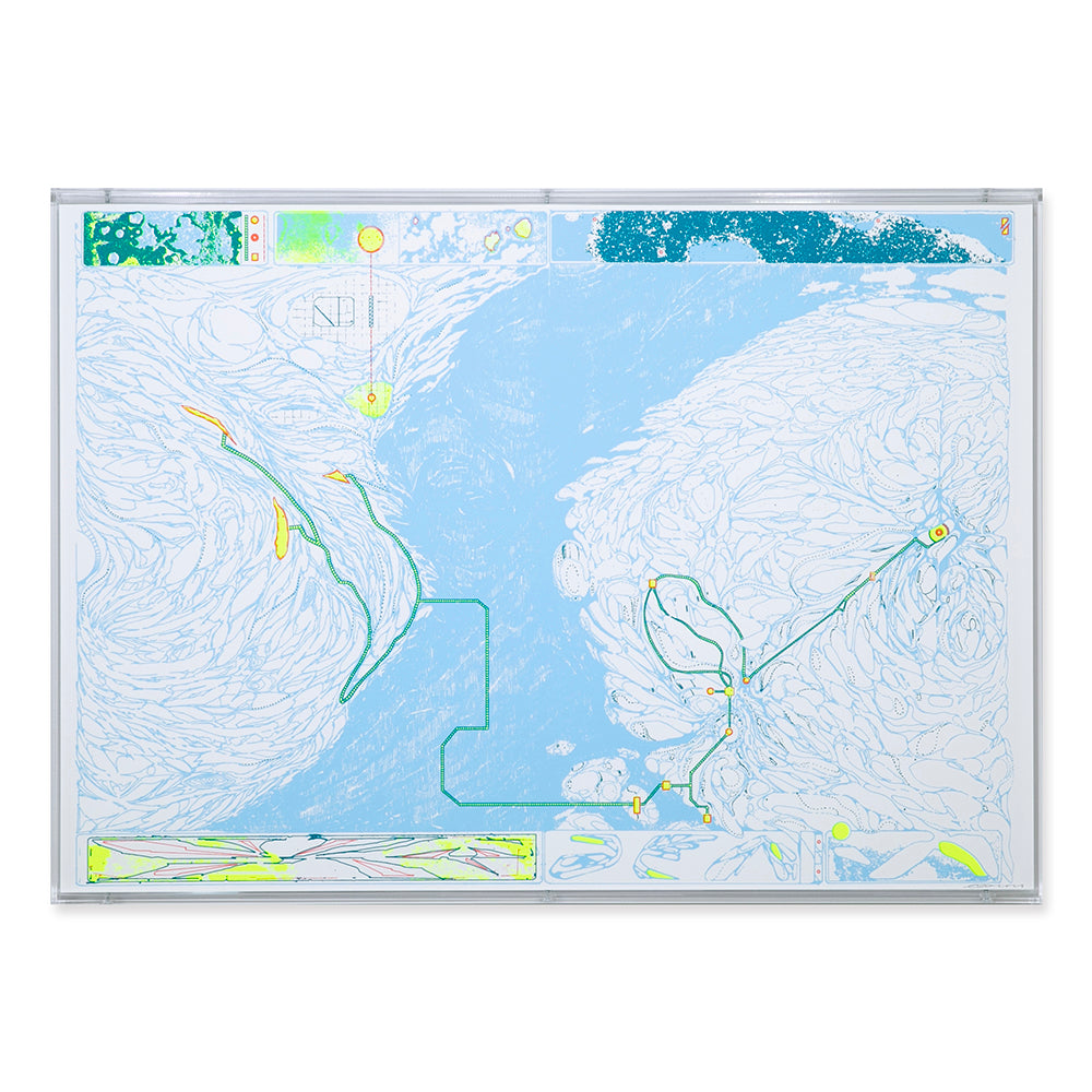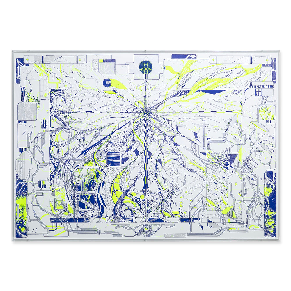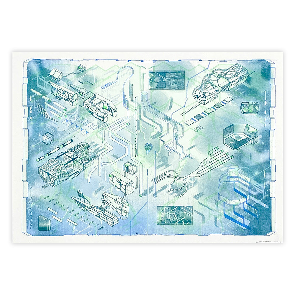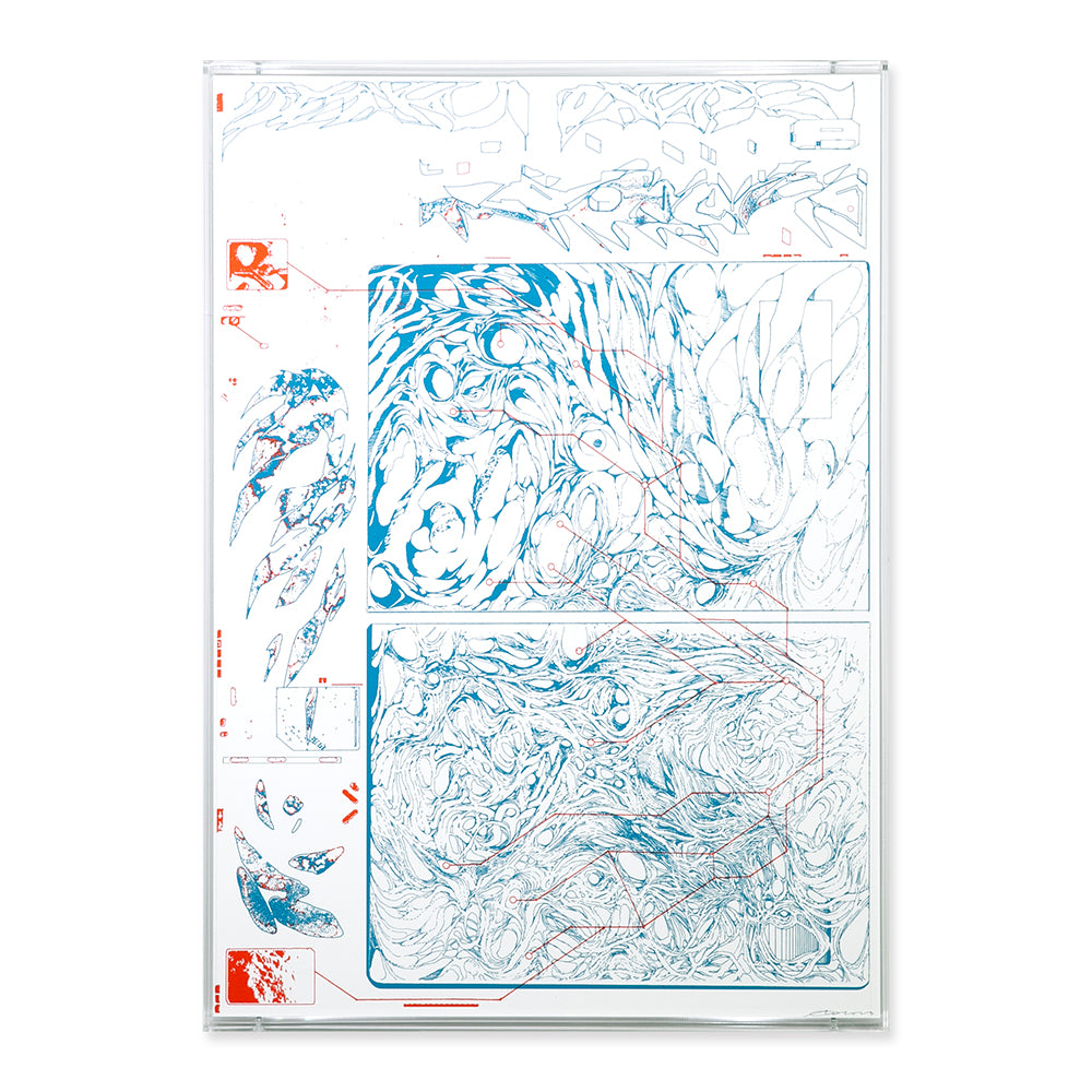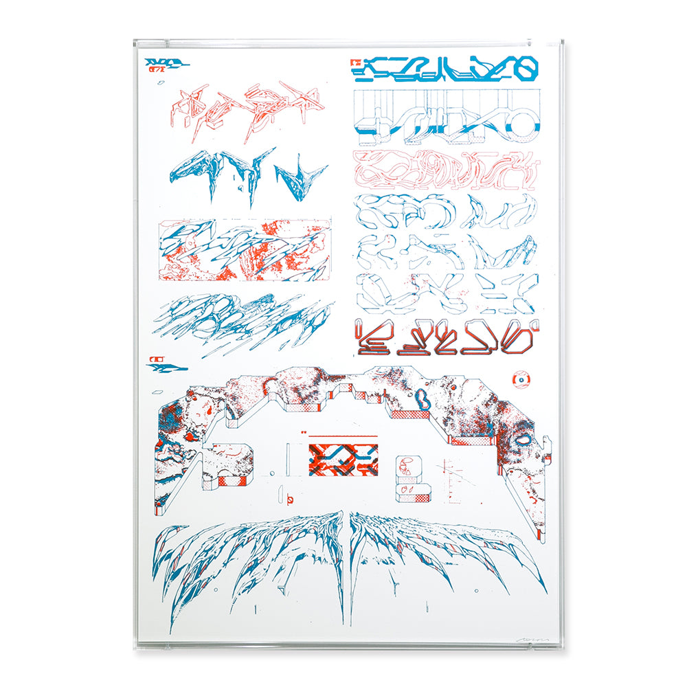 彼は様々な媒体を通して、人類の存在しない広大な独創的世界を構築しており、グラスゴーのレコードレーベル 12th Isleのジャケットや自身のプロジェクト “CRUDEX”からリリースされるzineやプリント作品などで、その世界を見ることができます。また、近年ではStone Island Shadow ProjectやBrain Deadへ提供したグラフィックなど、クライアントワークでもその断片を確認できます。懐古主義に溺れないアップデートされたサイバーパンクやSF的要素など、共有できる喜びに満ちた彼の作品群は、常に新鮮な驚きを与えてくれます。
