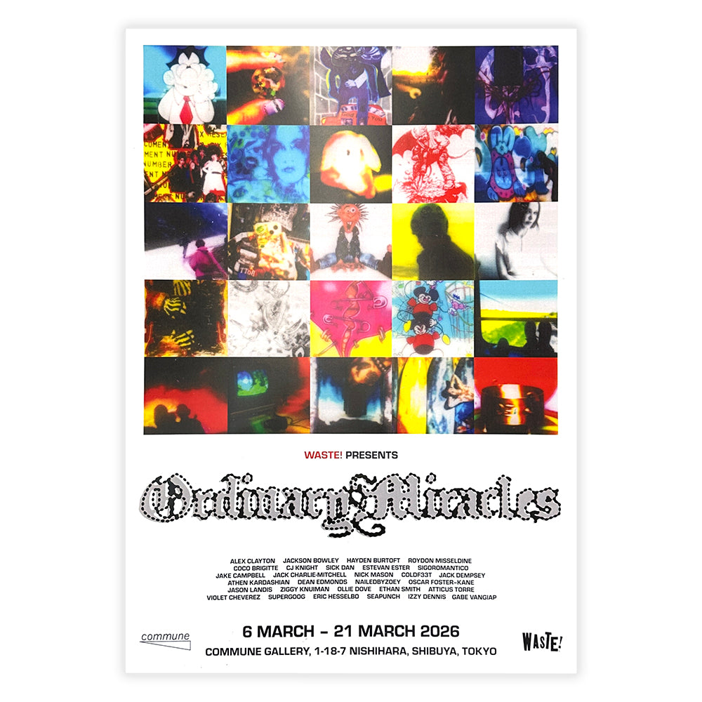 A limited edition A1 poster for the group exhibition "Ordinary Miracles" curated by London culture shop/space WASTE!. Design by Roydon Misseldine.