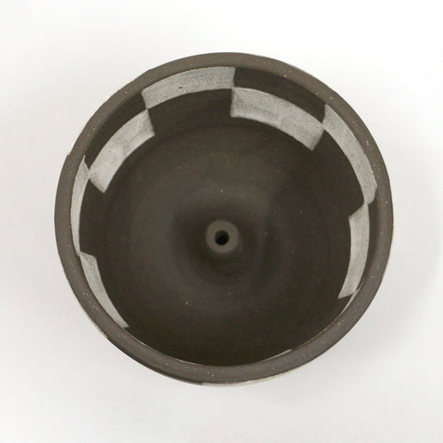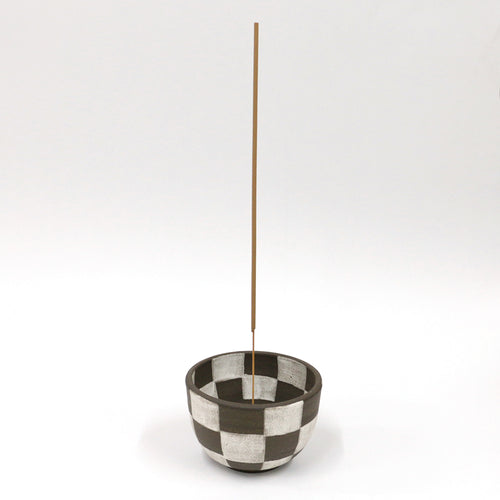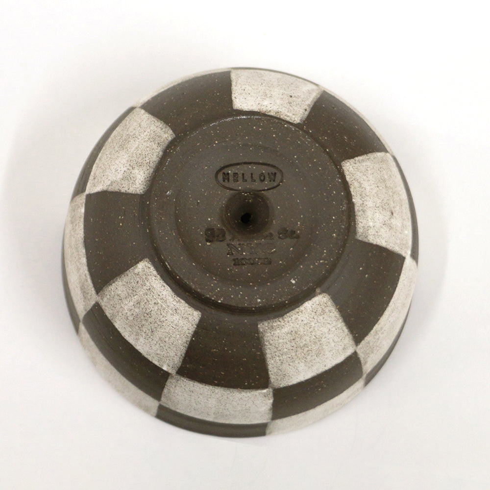 This incense holder is from Mellow, a handmade ceramic brand by Elise Grace Wilken. The back is engraved with the Mellow logo and address.