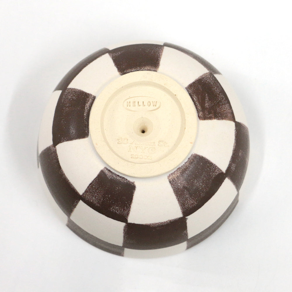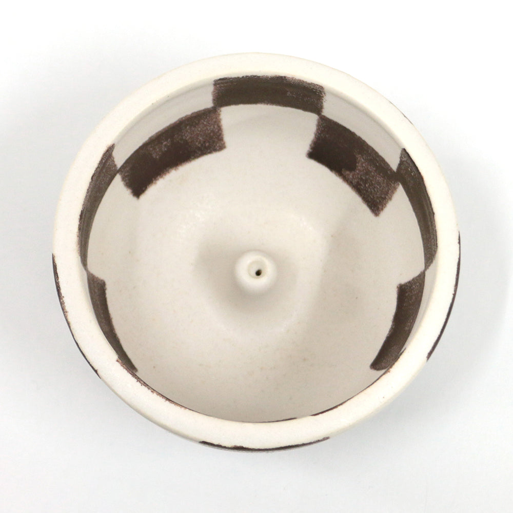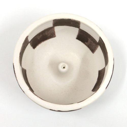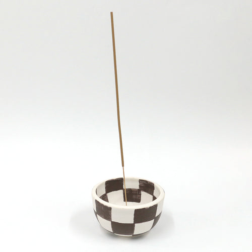 This incense holder is from Mellow, a handmade ceramic brand by Elise Grace Wilken. The back is engraved with the Mellow logo and address.