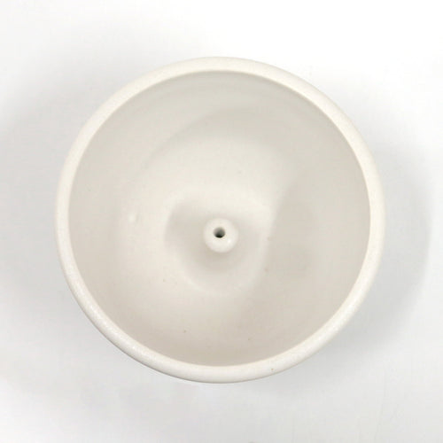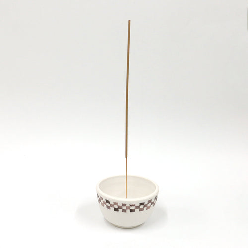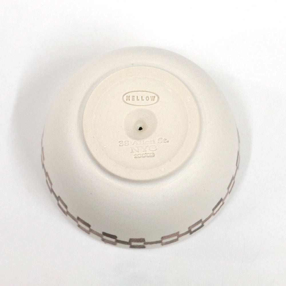 This incense holder is from Mellow, a handmade ceramic brand by Elise Grace Wilken. The back is engraved with the Mellow logo and address.
