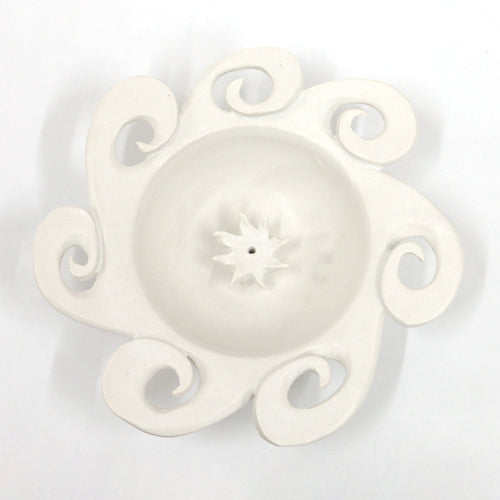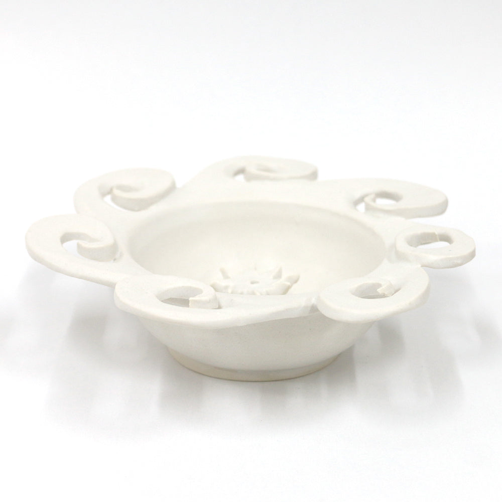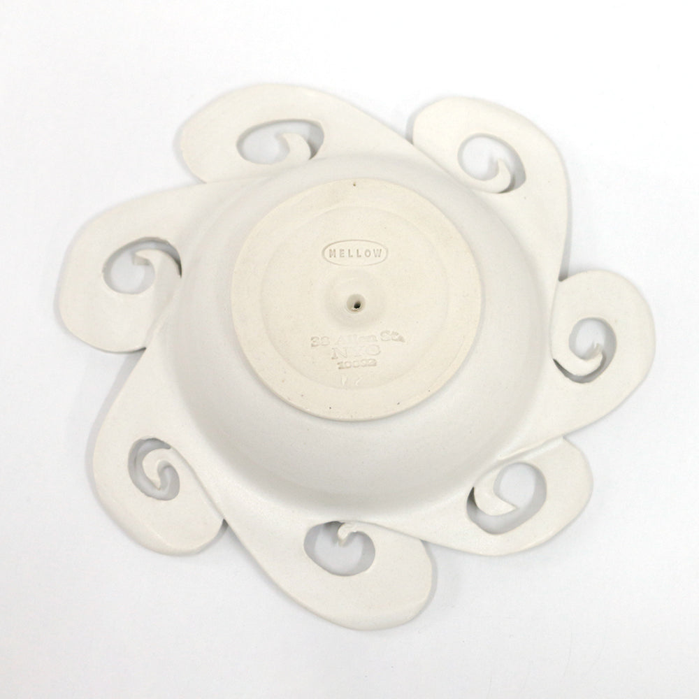 This incense holder is from Mellow, a handmade ceramic brand by Elise Grace Wilken. The back is engraved with the Mellow logo and address.