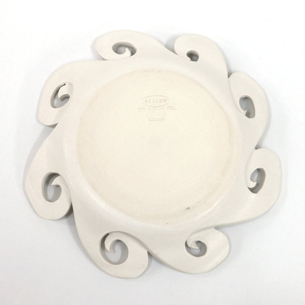 This plate is from Mellow, a handmade ceramic brand created by Elise Grace Wilken. The back is engraved with the Mellow logo and address.