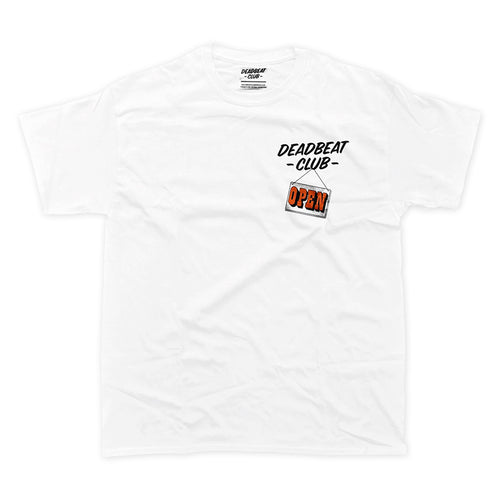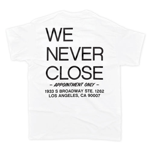 ロサンゼルス拠点の写真出版レーベル Deadbeat ClubのWe Never Close Tシャツ。実店舗を持たない Deadbeat Clubが、常にオープンなオンラインショップの特性を活かしつつ、アポイント制でしか訪れられないオフィスの住所をあえてプリント。彼らがずっと作りたかったいう憧れのショップTシャツのような、遊び心と皮肉が効いた一枚です。