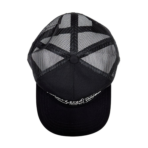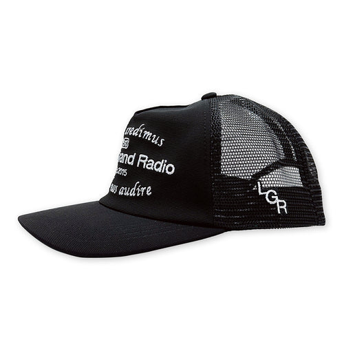 カリフォルニア州 オークランド拠点のインターネットラジオプラットフォーム Lower Grand Radioのハット。ラテン語で「私たちは信じると同時に聞いているのだ。」というテキストが落とし込まれています。